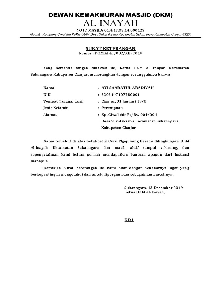 Contoh surat pernyataan guru ngaji Surat Keterangan Guru Ngaji Dari Dkm