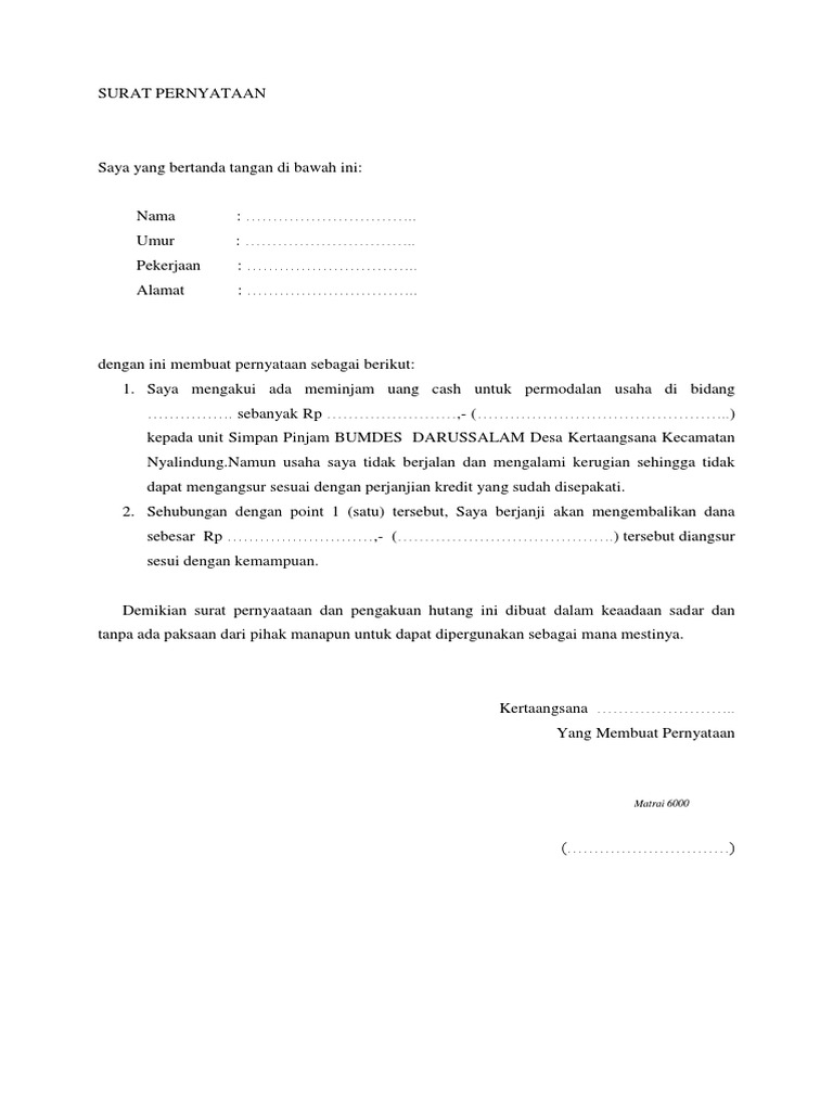 Contoh surat perjanjian simpan pinjam bumdes Surat Perjanjian Pinjam Uang