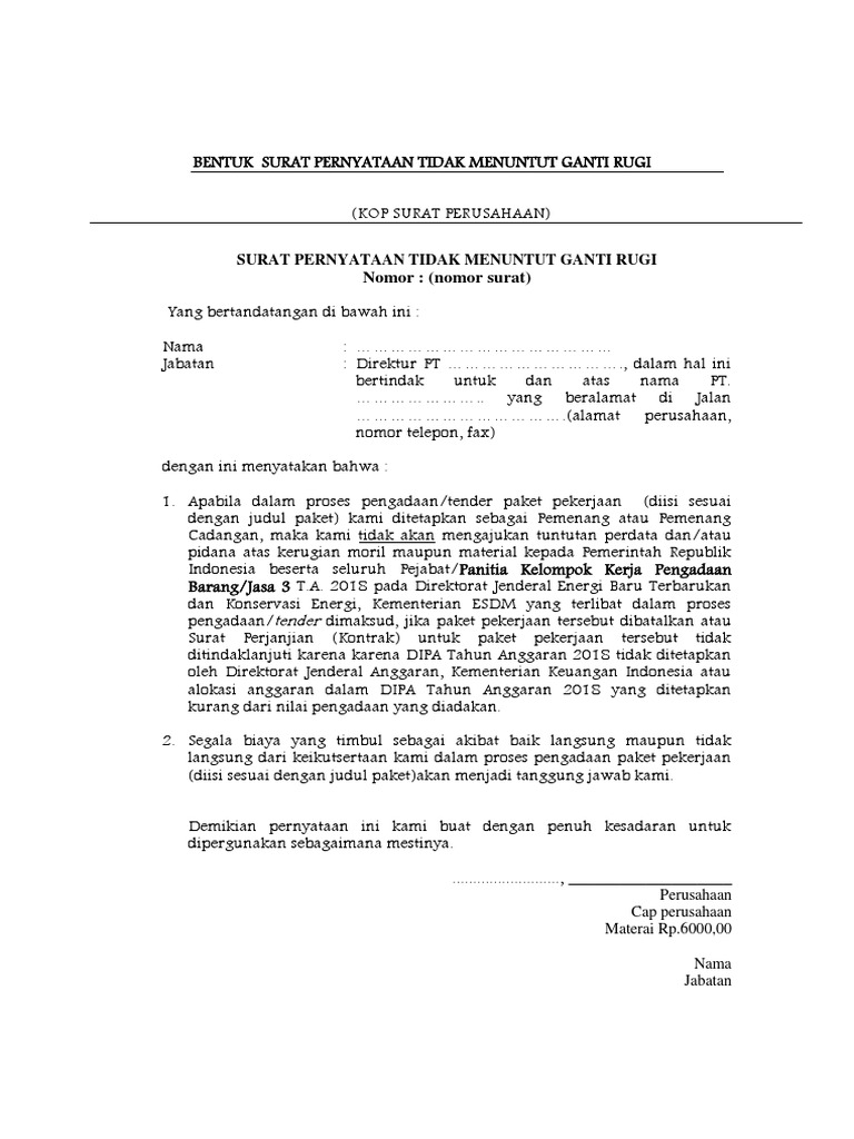 Bersedia ditempatkan di wilayah kegiatan yang ditetapkan oleh Dinas provinsi yang membidangi perkebunan. Inilah informasi yang dapat kami sampaikan Surat Pernyataan Tidak Menuntut Ganti Rugi. Tanggung Jawab Biro Travel Perjalanan Wisata Terhadap.